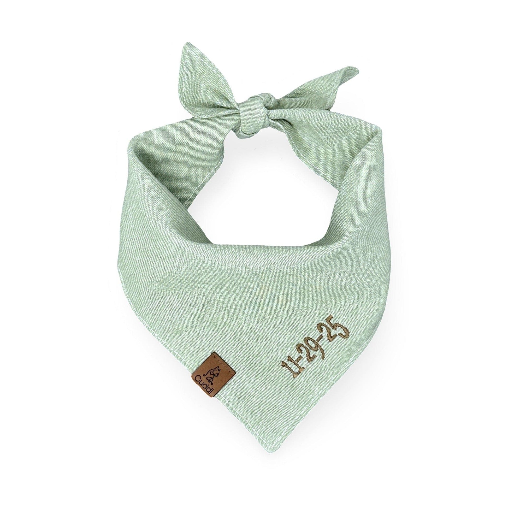 This stunning dusty sage pet bandana is made from luxurious linen in a beautiful soft sage color. The ultimate accessory for your engagement photos or any special occasion! Customize it with your wedding date or your dog's name. Each bandana is lovingly crafted in California and has a unique shape to ensure a perfect fit around the neck.