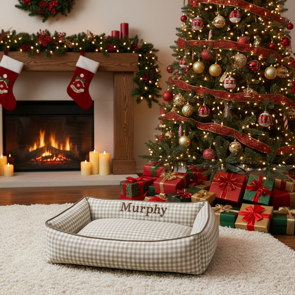 The Ecru Gingham Dog Bed features a classic gingham pattern in warm chestnut hues, adding a cozy, timeless charm to any room. Handmade in the California from sustainable materials.