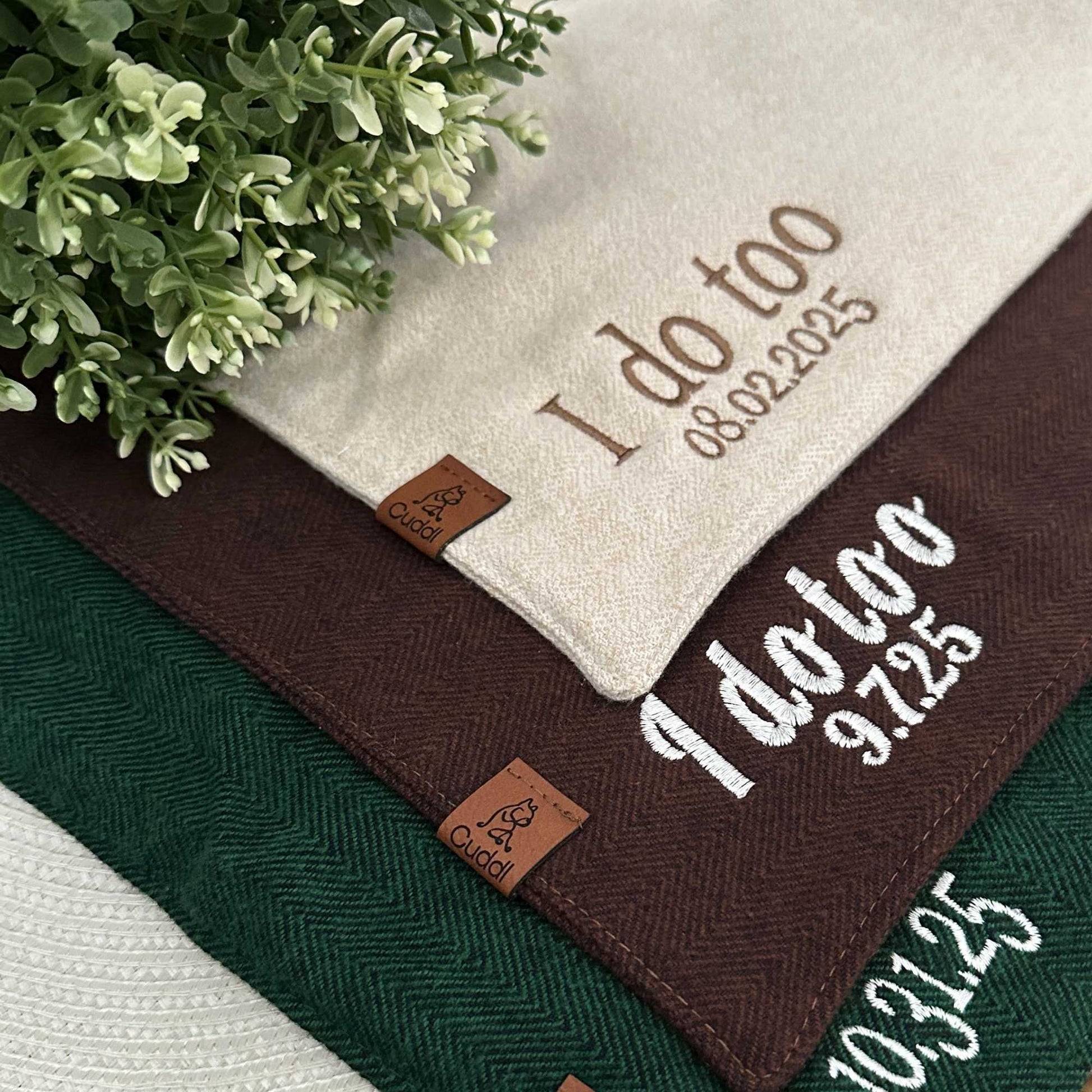 Let your pet join the celebration with the I Do Too Date Dog Bandana! Crafted from premium linen and adorned with custom embroidery, this Wedding bandana enhances your engagement day perfectly. It keeps your furry friend looking flawless in photos and adds a stylish, meaningful touch to your special moments.