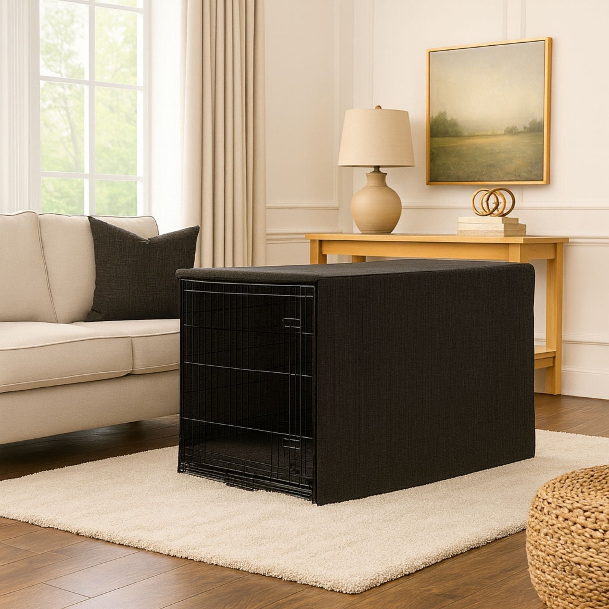 Keep your dog's crate stylish and secure with this Ink Textured Solid pet crate cover set. It offers privacy and comfort while allowing ventilation through roll-up panels with metal snaps. Blending convenience with elegant design.
