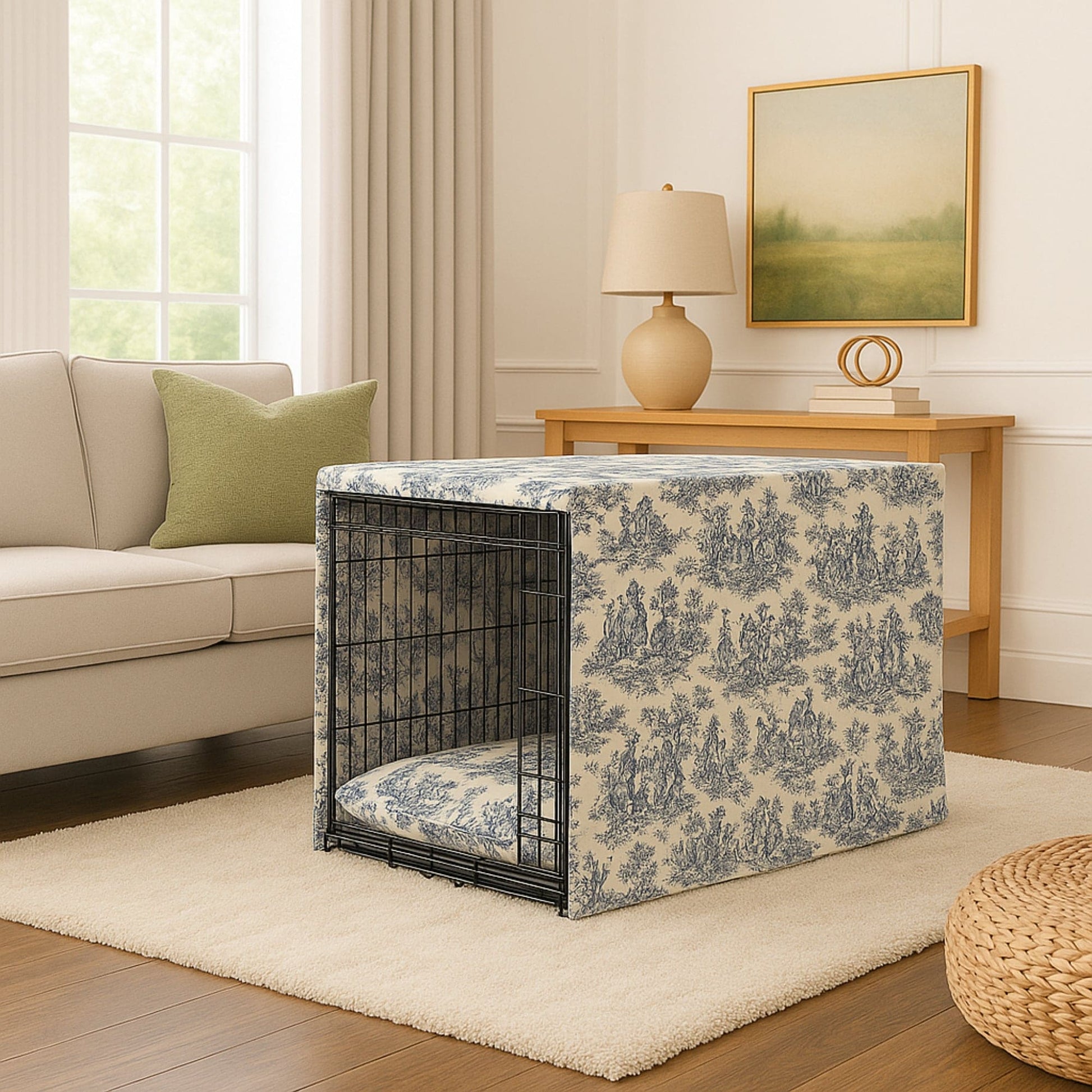 Keep your dog's crate stylish and secure with this toile pet crate cover set. It offers privacy and comfort while allowing ventilation through roll-up panels with metal snaps. The washable crate mattress features a removable cover and water-resistant interior, blending convenience with elegant design.