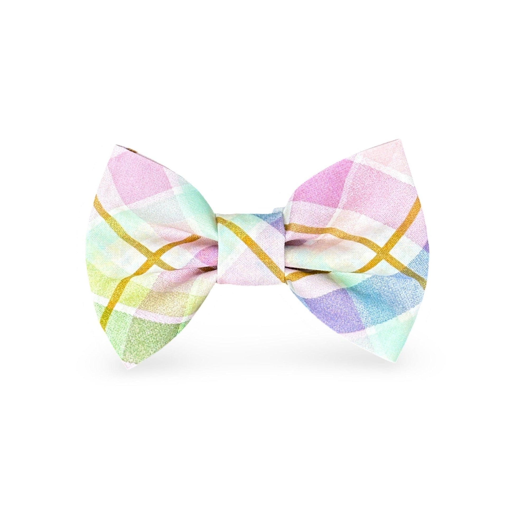 Add some fancy flair to your pup's wardrobe with our Pastel Plaid Spring Bow Tie! Elevate their fashion game with this stylish accessory featuring soft pastel colors perfect for Easter or spring. With periwinkle, soft greens, and blue, this bow will surely make your furry friend stand out.
