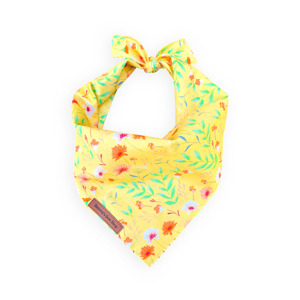 Transform your pet's springtime look with our Reflective Meadow dog bandana! Boasting a charming petite wildflower print on a vibrant yellow background, this handmade accessory is crafted with premium materials for comfort and durability. Inject a burst of color and nature-inspired charm into your furry friend's ensemble during those refreshing spring strolls.
