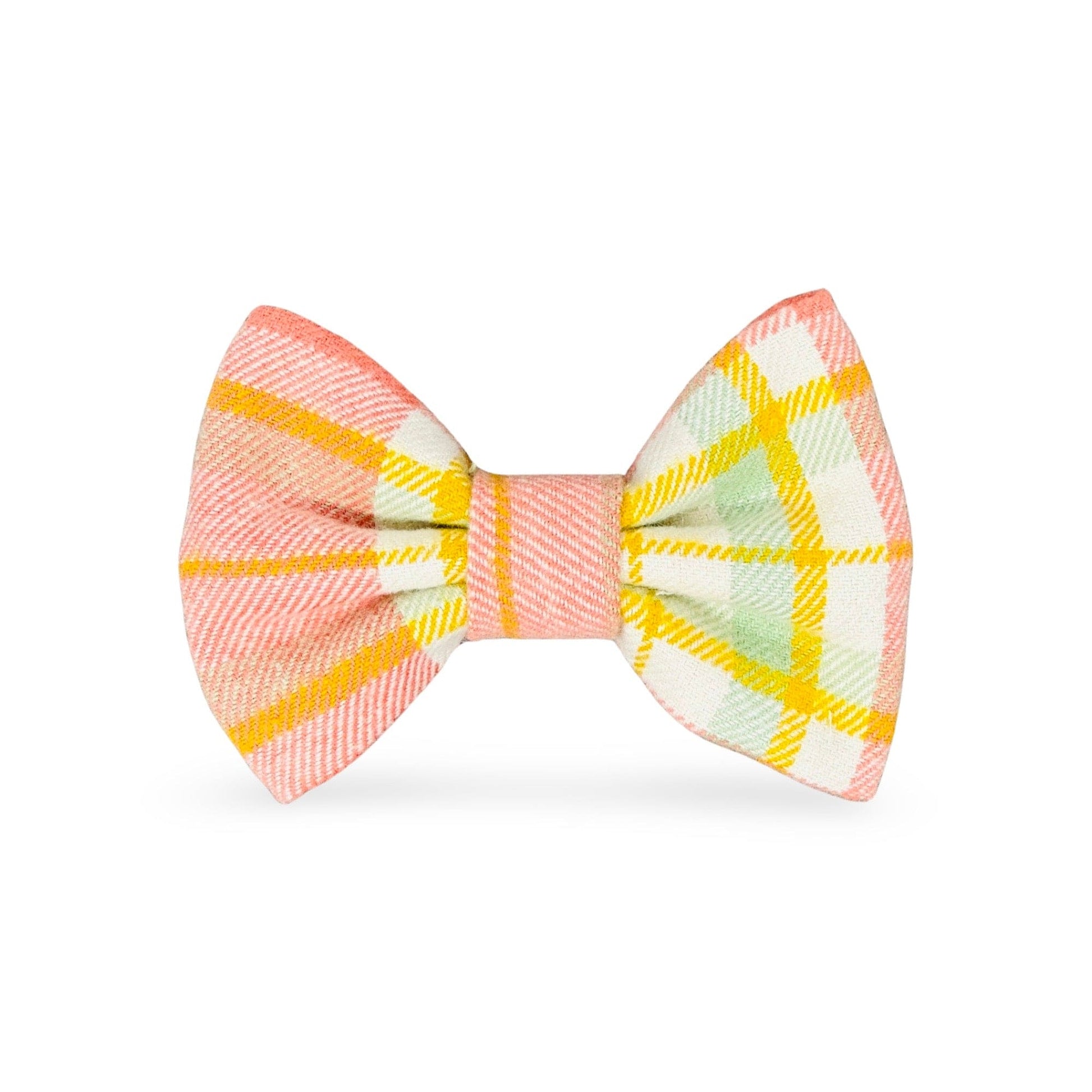 Add instant dapper to your pup's outfit with our handmade Tulip Grove Dog Bow Tie. Made in the USA with a beautiful pink check print on soft flannel. Slip on and off easily with two elastic loops to prevent bow droop.